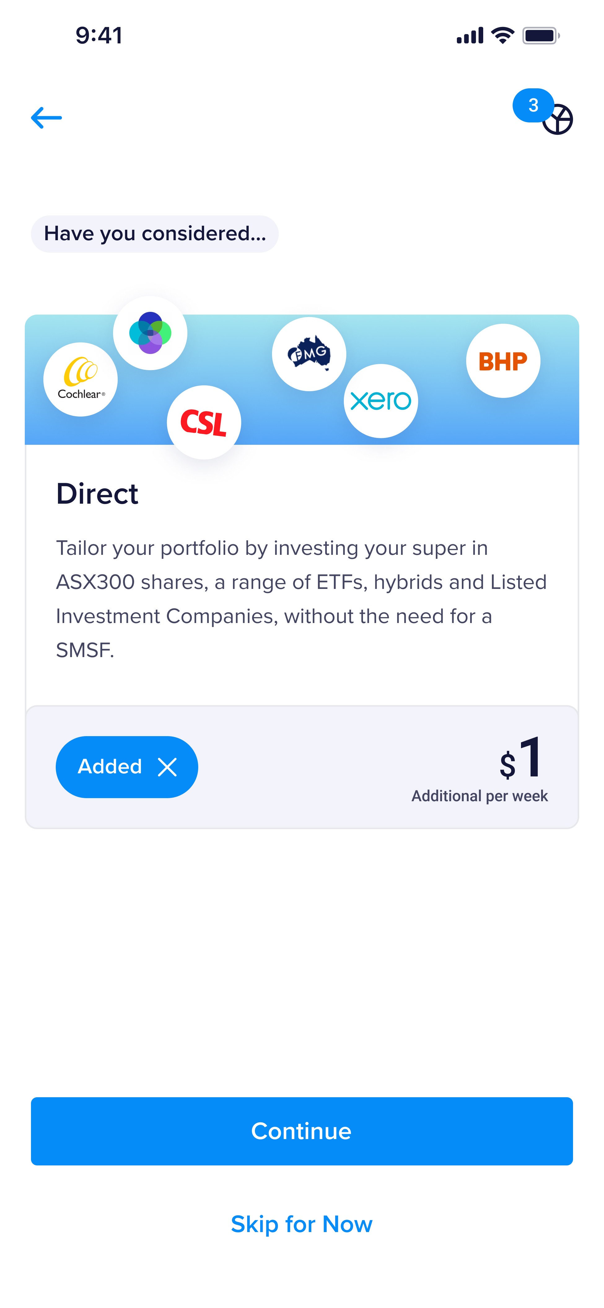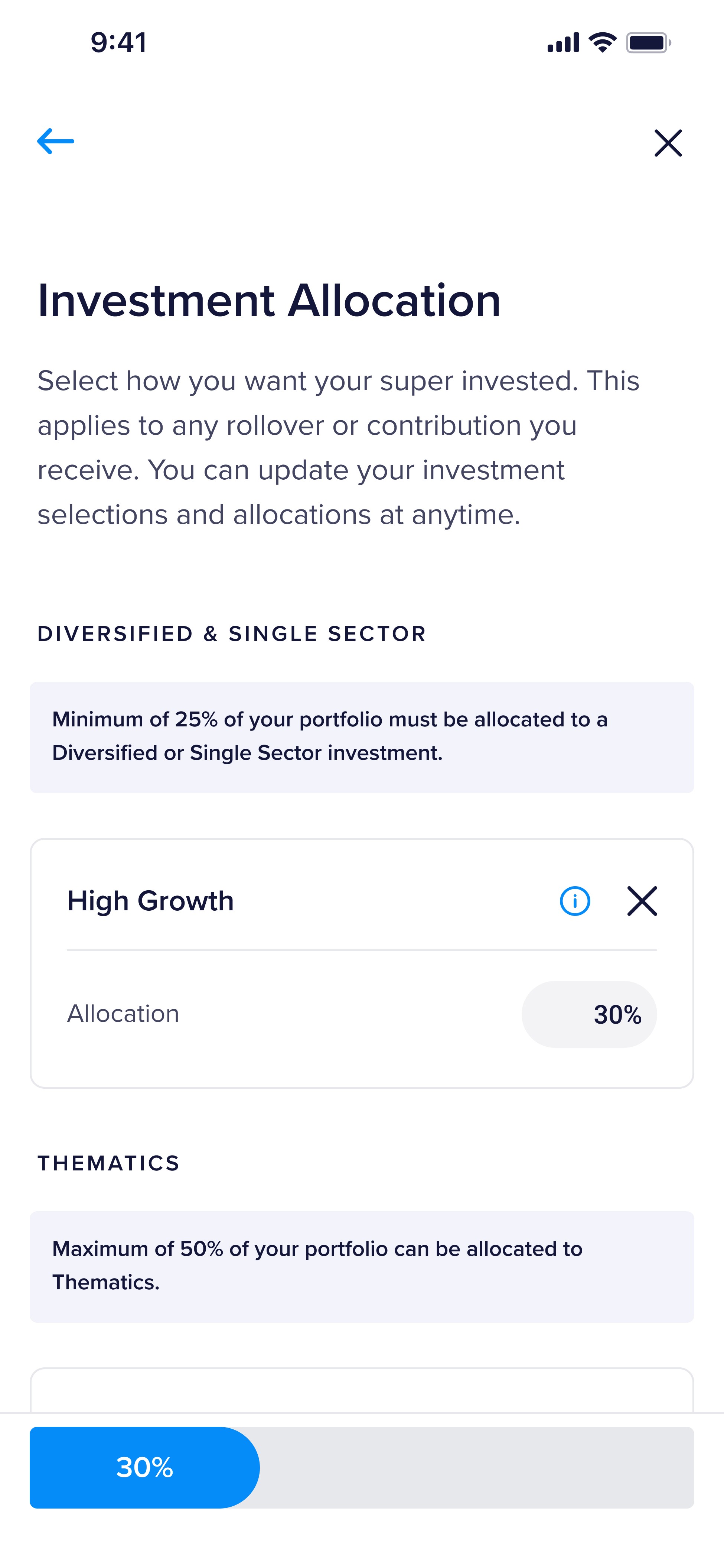 In response to these findings, we implemented a broader array of investment options, empowering users to diversify their portfolios. Simultaneously, we maintained accessibility by allowing users to invest a portion of their portfolio in the ASX for a nominal fee of $1 per week. Additionally, a new page was introduced to provide users with a centralised platform for managing their investments, offering enhanced control over their superannuation.